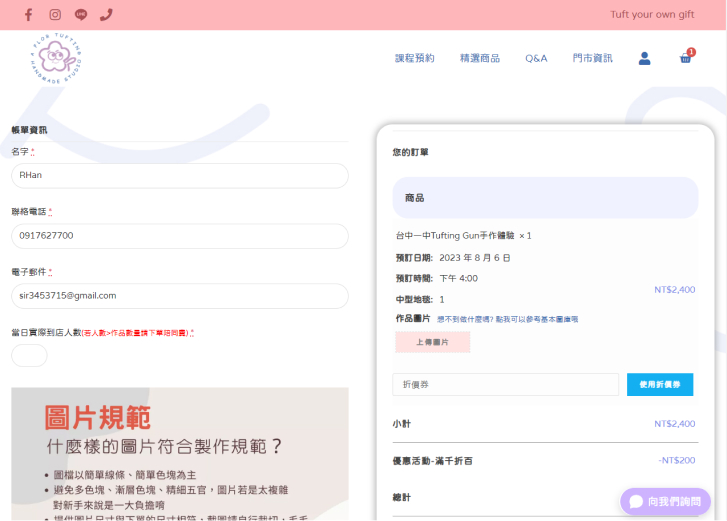 結帳頁上傳希望作品圖,後台可進行圖片審核,若未通過將透過Email進行補件通知與動作